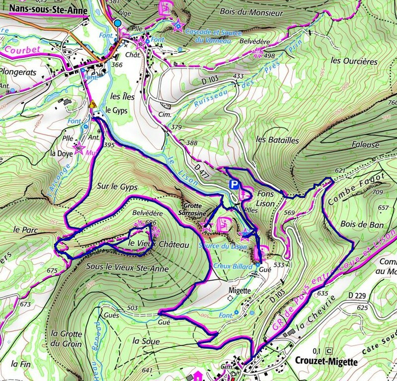 Descriptif de la sortie : Marche sur sentiers accidentés parfois rocailleux donc glissants. Bâtons de marche conseillés. Points d'intérêts : le village de Nans sous Sainte Anne, le belvédère du Vieux Château, le village de Crouzet-Migette, le Creux Billard, la source-résurgence du Lison, la grotte Sarrasine et l'ancienne taillanderie. Nombreux points de vue et belvédères.