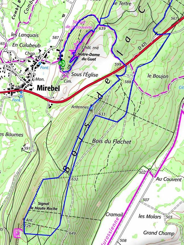 Mirebel : depuis L'Eglise passage aux ruines du Chateau, puis bords de la côte jusqu'au signal de Haute Roche. Retour modulable en fonction du groupe et du temps.