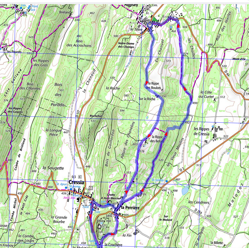 Information complémentaire sur la sortie(renseignement facultatif): randonnée facile. Au départ d'augisey, nous monterons en direction des Serrans (belle vue sur les Monts Jura) puis nous traverserons le hameau de la Perrière (lavoir), puis Cressia (lavoir, fontaine) puis La Crochère (fontaine et chateau) et retour par le bois (cabane de berger) puis les prairies.