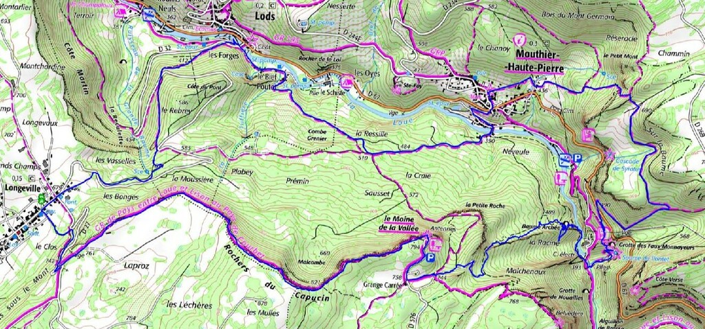 Descriptif de la sortie : Départ Longeville, descente à Lods puis le bief Poutet, Mouthier Hautepierre, grotte des Faux Monnayeurs, Baume Archée, Grange Carrée, Belvédère du Moine, Rocher du Capucin,et retour à Longeville.