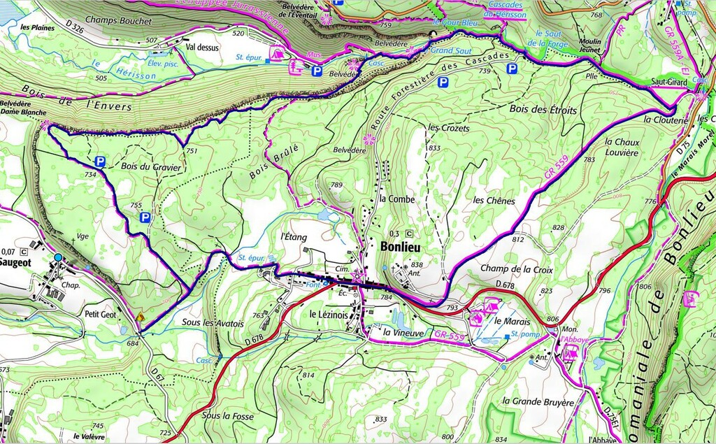 Descriptif de la sortie : Randonnée panoramique sans difficulté qui rejoindra tout d'abord le belvédère de la Dame Blanche. Puis à travers bois , nous cheminerons pour atteindre les cascades du Hérisson qui auront enfin retrouvé un peu de leur quiétude. Retour à Bonlieu par le GR 559 puis SAUGEOT.