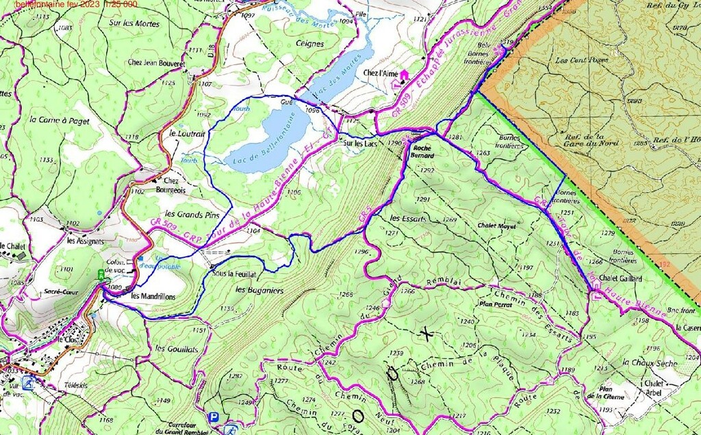 Départ du petit parking au départ du chemin du Risoux, passage sous la Feuillat puis montée au belvédère de la Roche Bernard. Puis belvédère côte 1319 m. Direction le chalet Gaillard pour poursuivre jusque Chez L’Aimée. Passage entre le lac des Mortes et le lac de Bellefontaine. Retour au départ par Les Mandrillons.