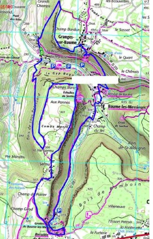 Descriptif de la sortie : Départ de grange sur Baume pour aller à la Peyrouse par le sentier de crête. De la Peyrouse montée en direction de Sermu, puis champ baron, haut des échelles, hameau de Sermu, belvèdère des Roches, cascade, sentier du Dard, Baume les Messieurs et retour à Grange sur Baume.