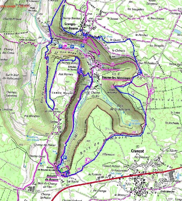 Information complémentaire sur la sortie (facultatif) : Départ du belvédère, cascade des tufs, descente le long du Dard, montée des échelles de Sermu, passage au camping de Baume les Messieurs, montée à granges sur Baume et poursuite sur le plateau pour retour au départ en passant par le belvédède du suchot.