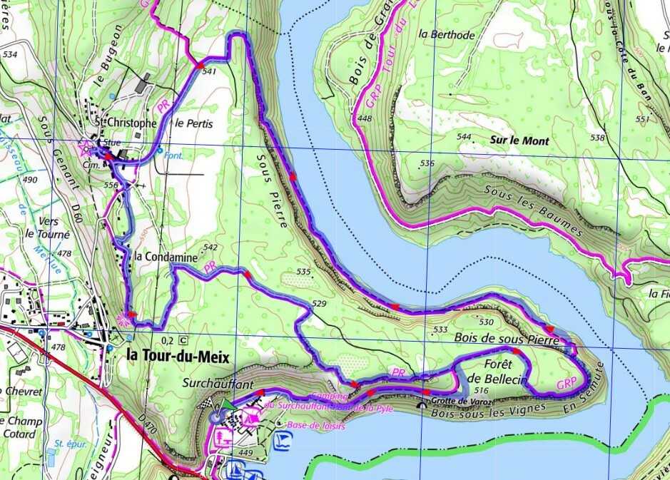Information complémentaire sur la sortie : Randonnée sans difficultés. Boucle pour profiter de nombreux belvédères sur le lac de Vouglans, du hameau de Saint-Christophe (église romane et panorama) et des ruines du château de la Tour du Meix (panorama).