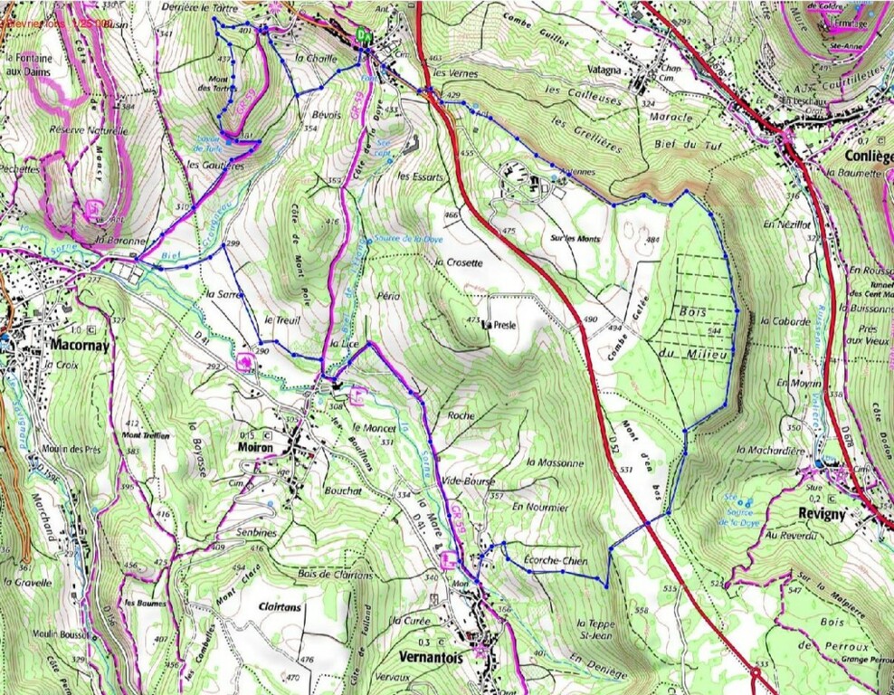 Descriptif de la sortie : Cheminement de montaigu via le mont des tartres, le lavoir, le golf, Vernantois, Ecorche chien, le mont d'en Bas, pour revenir via l IME.