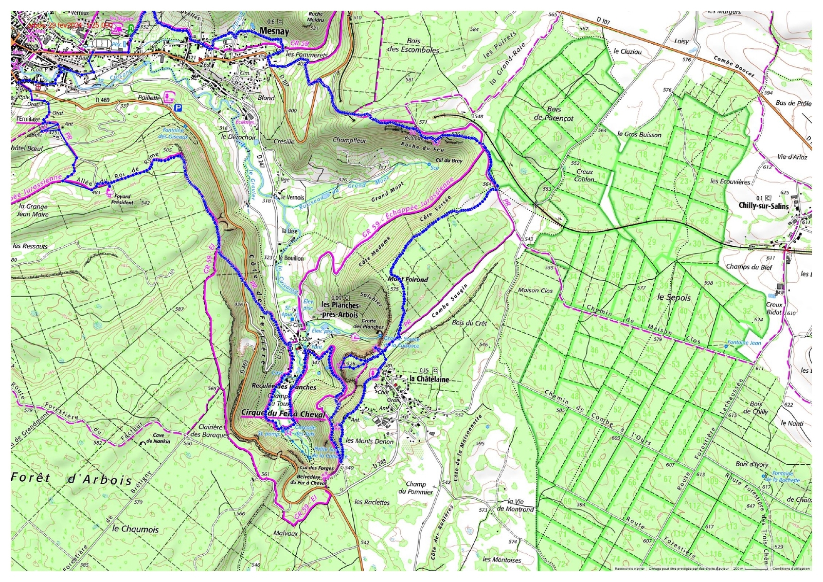 Descriptif de la sortie : Départ de la piscine, passage à Mesnay montée à la roche du feu, la chatelaine, les planches près d'arbois, cirque du fer à cheval, côte de ferrière, foyard président, Ermitage, arbois.