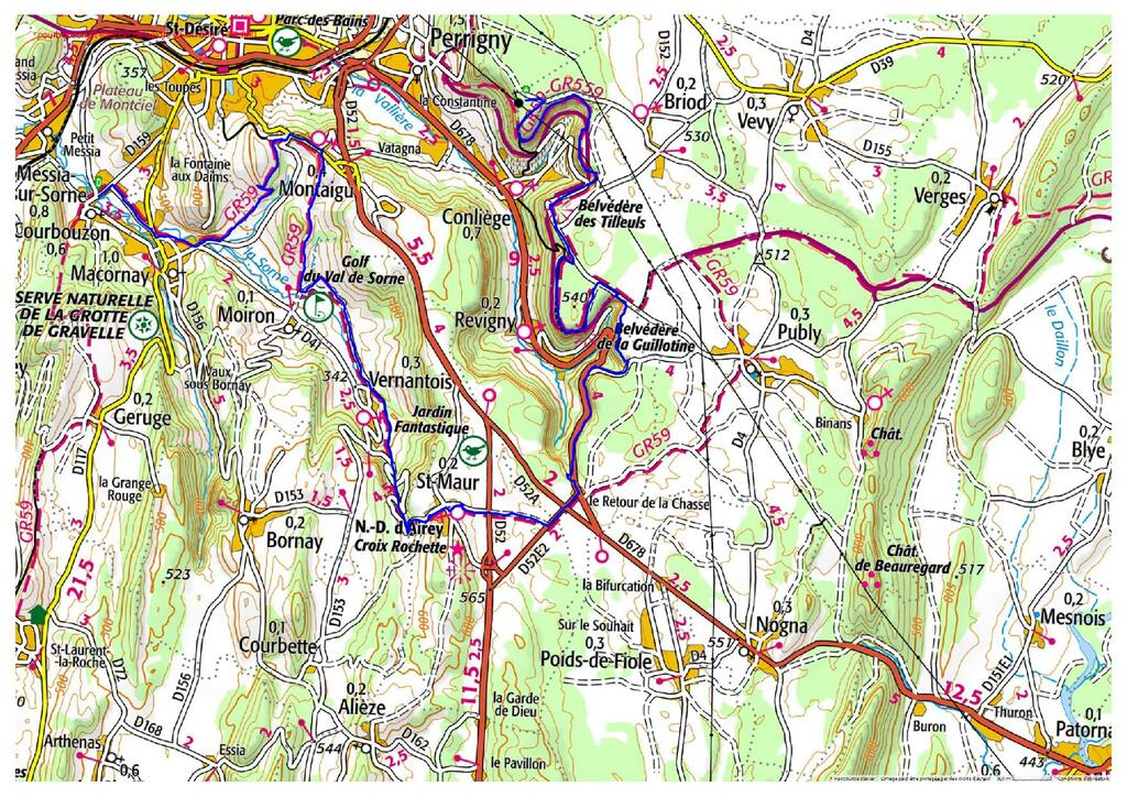 La randonnée qui nous concerne part de Nice direction La Capitale. Cette randonnée traverse le Jura en empruntant le GR59. Pascale et Marie Christine font le trajet de Vergongeat (01) à Arc et Senans (25) sur 11 jours avec une jounée de repos (le 29 mars) soit une distance de 207 km