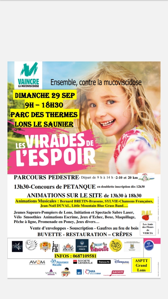 La Virade de L'Espoir au profit de l'association Vaincre La Mucoviscidose aura lieu le Dimanche 29 sept de 9h à 18h30 au Parc des Thermes de Lons le Saunier.